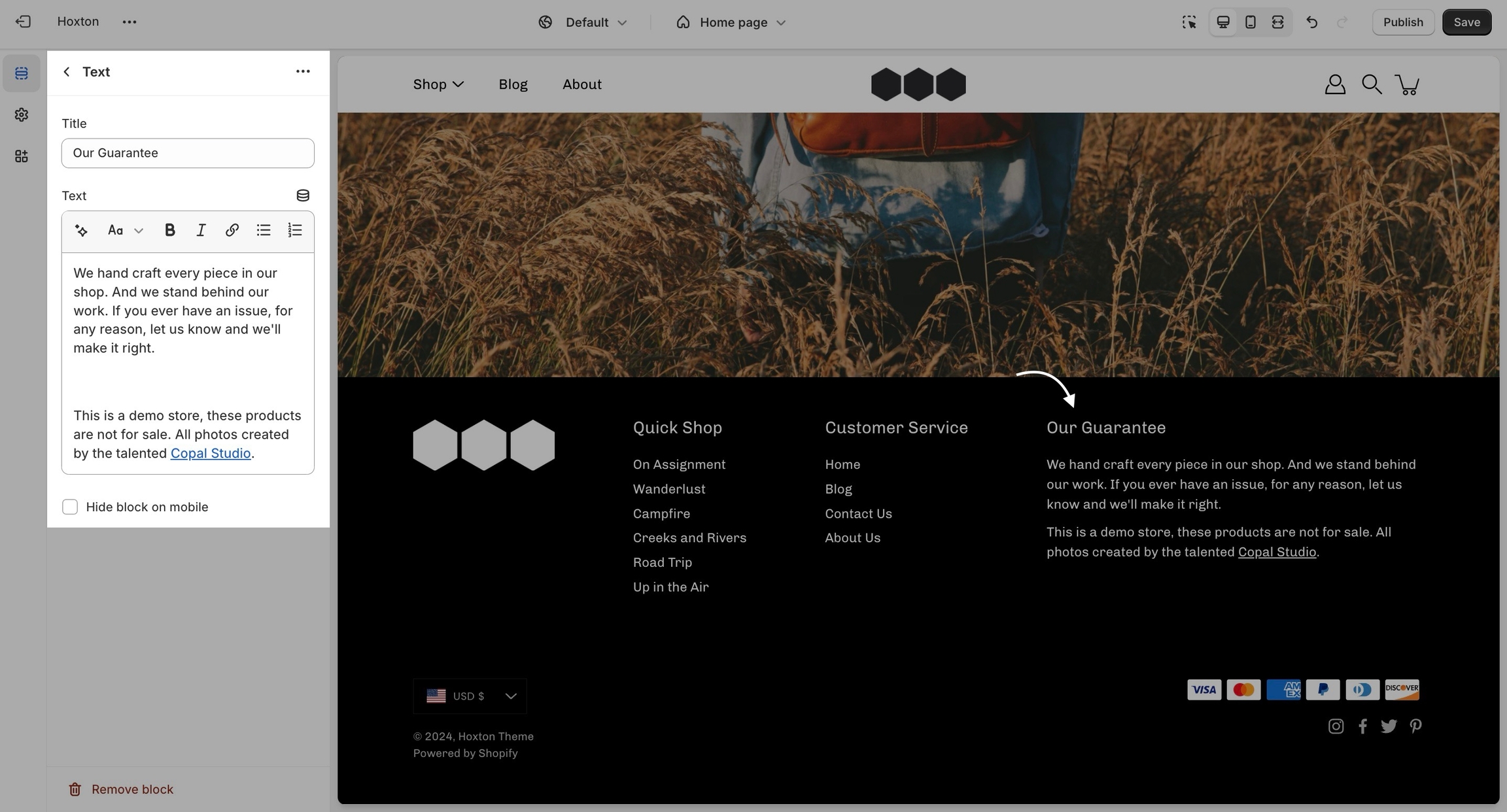 A text block does as a text block sounds. You can add a short message with a heading to give information about your brand or current promotions.