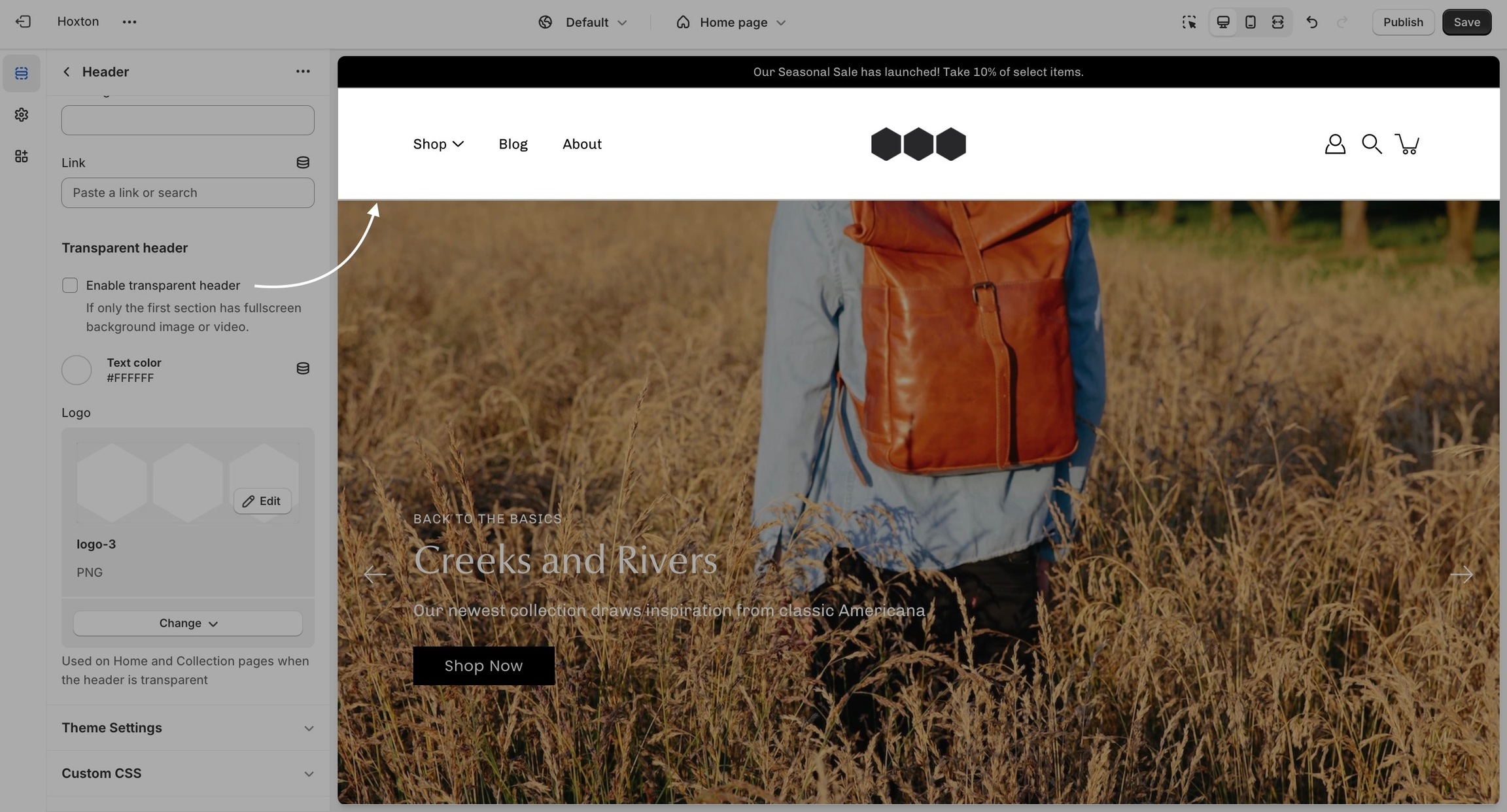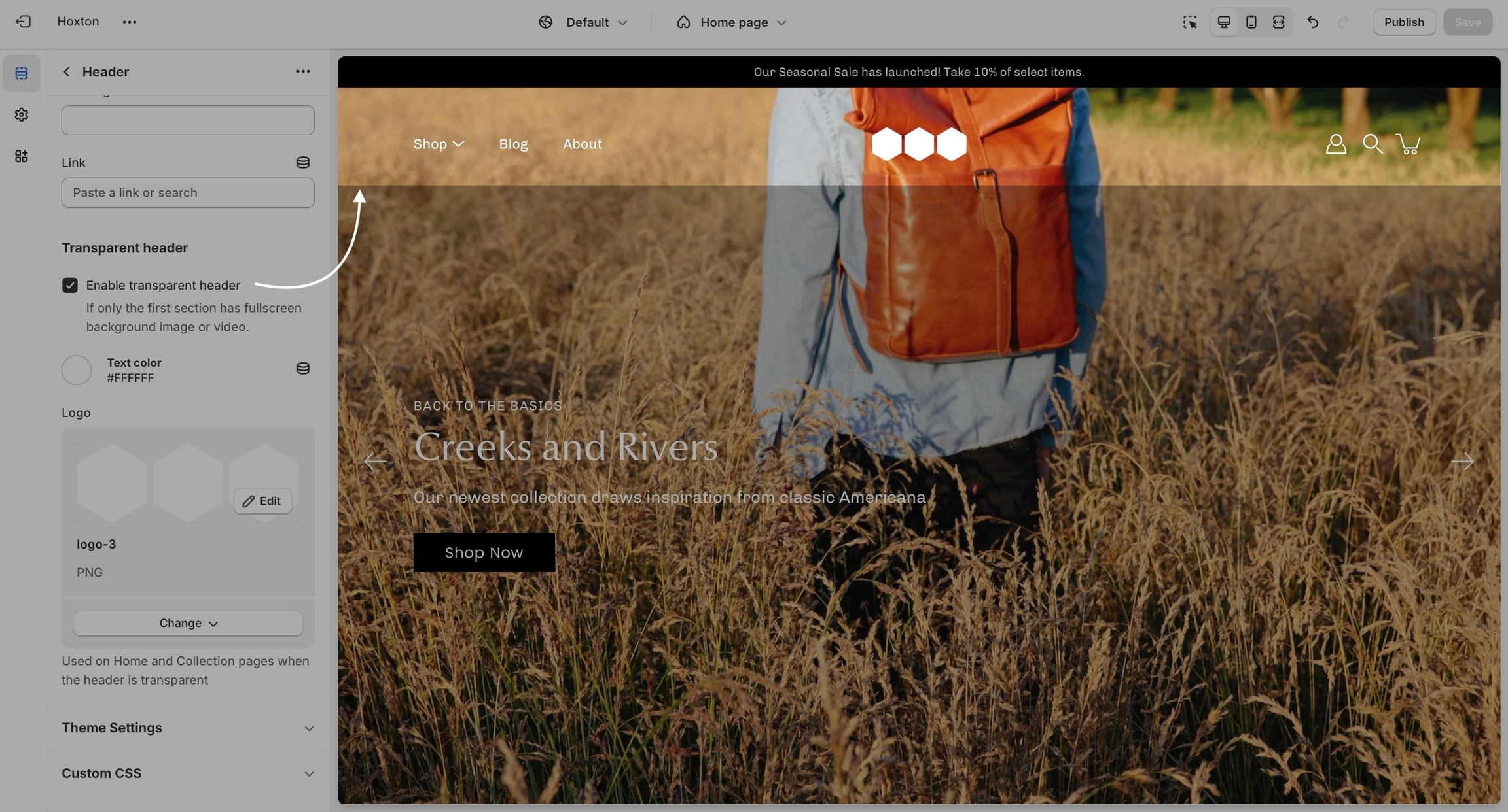 To enable the transparent header you will need to first open the header section settings. From here, simply check the 'enable transparent header' checkbox and save the changes.
