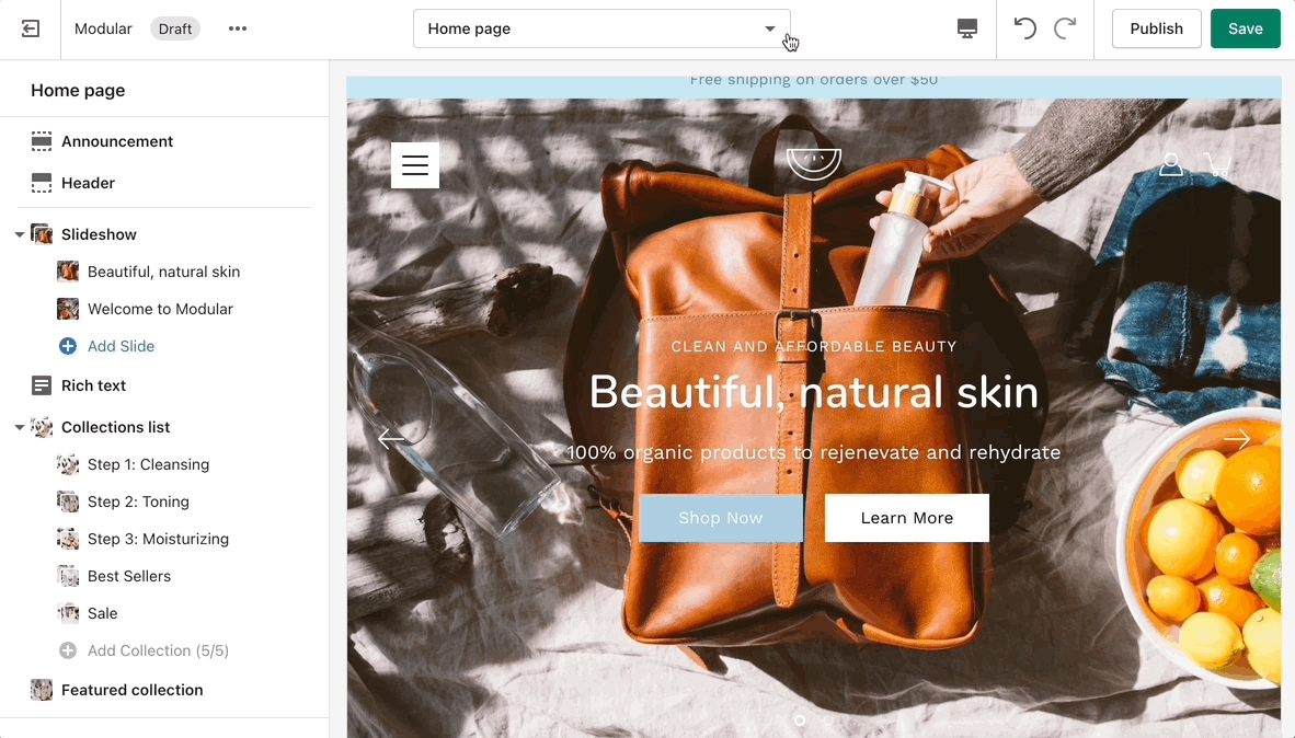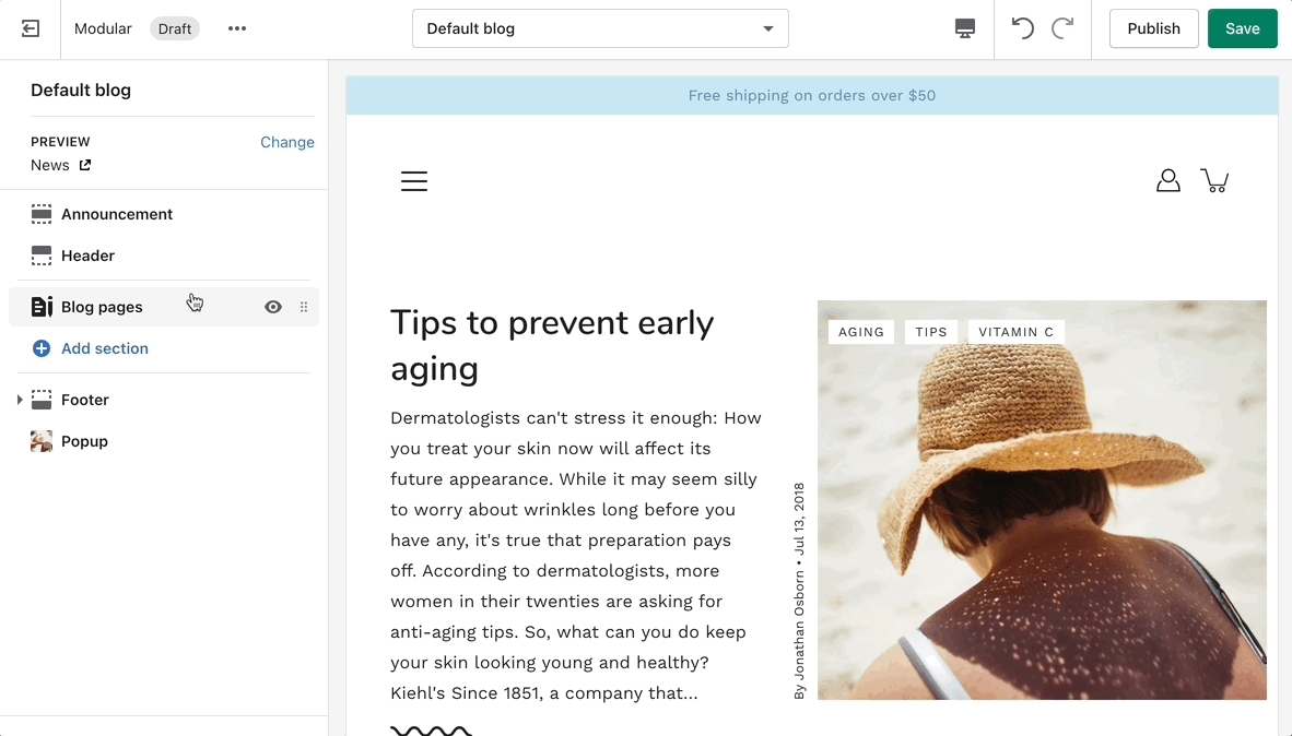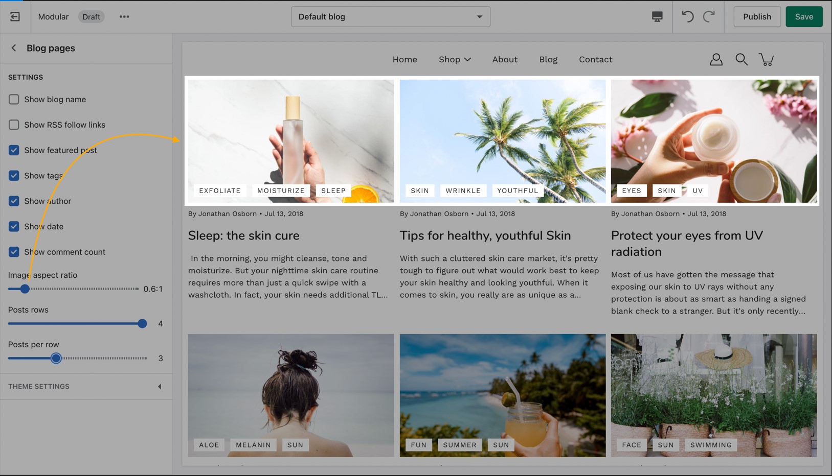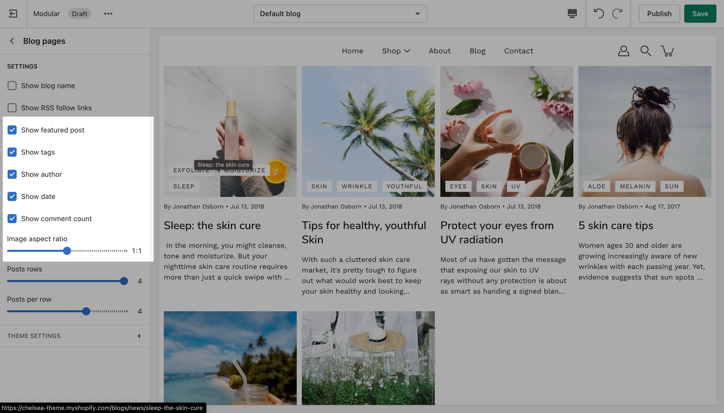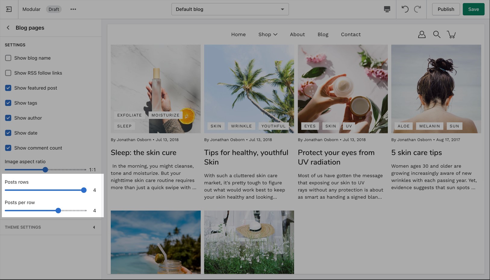 Modular displays a rich grid of all your blog post articles. Click on Blog pages to configure the layout of your blog index page.