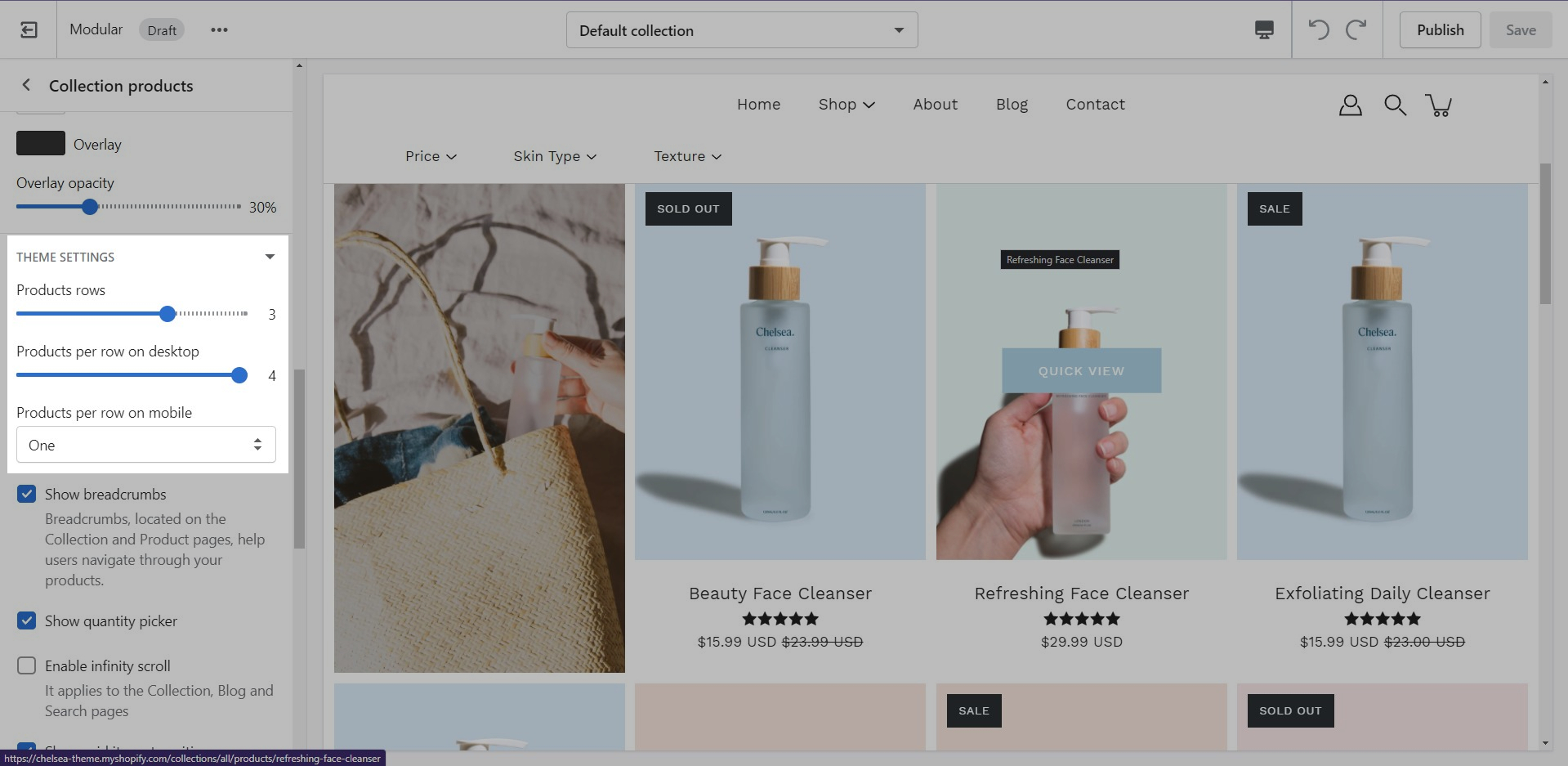 Expand the Theme Settings panel to view additional settings related to the product grid: