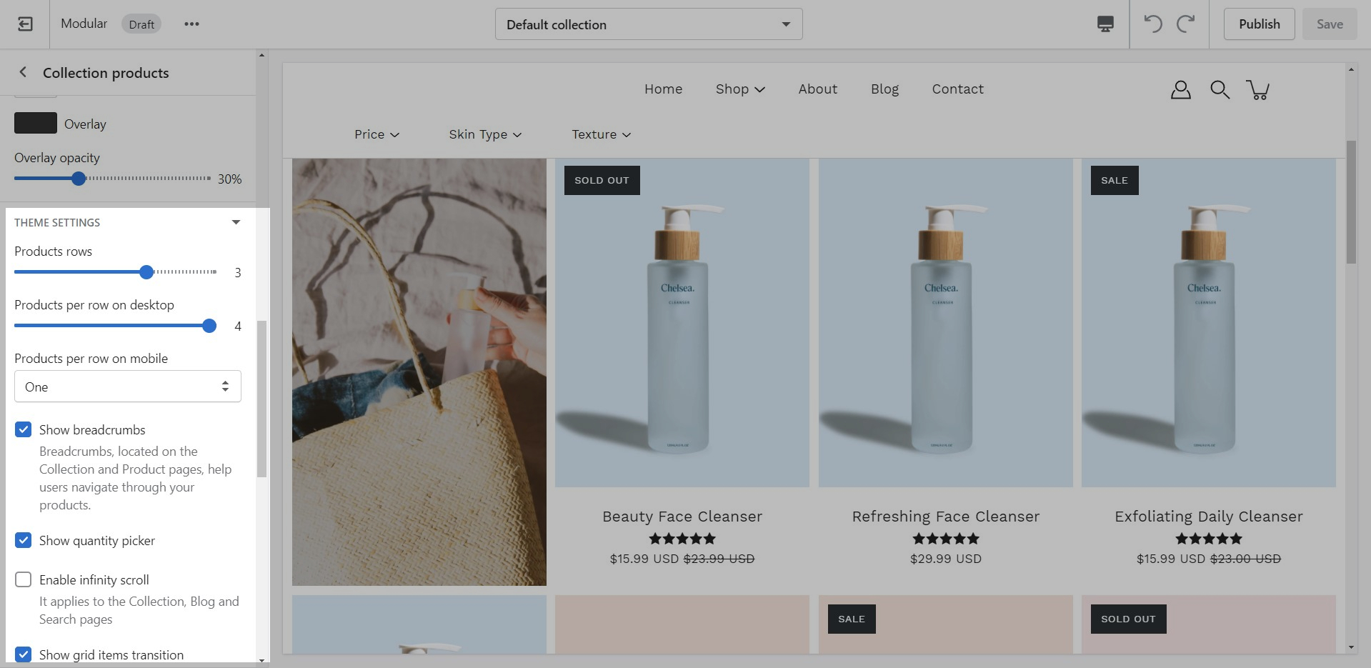 Use the Product Grid options to customize how many products per row are displayed on desktop and mobile. You can also configure how many products per page are shown before pagination is displayed.