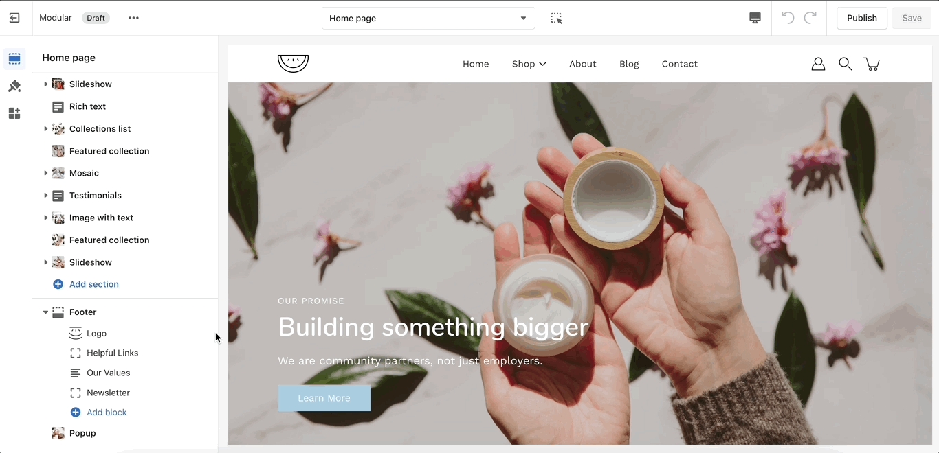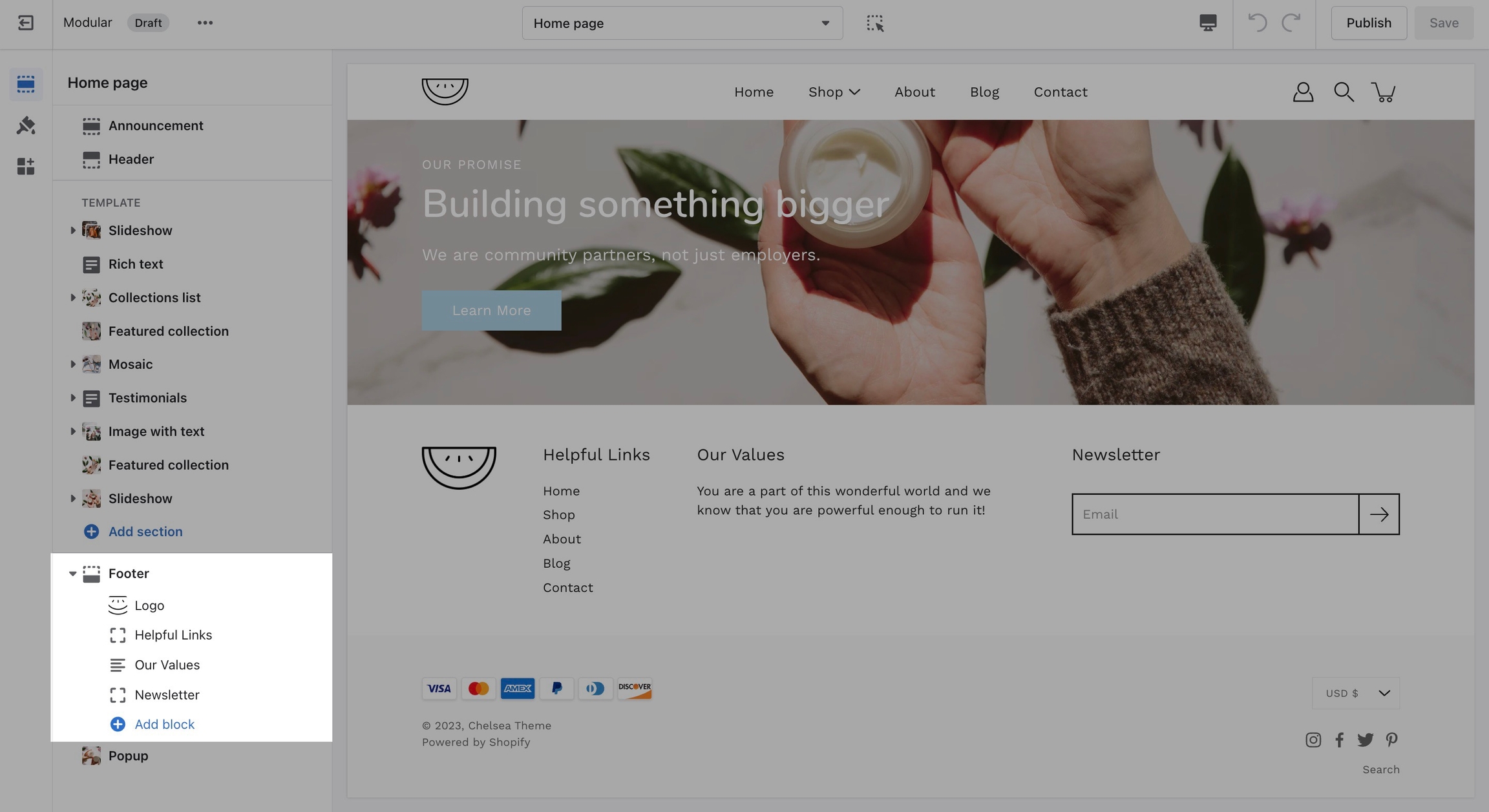 The Footer in Modular has a lot of customizable elements in the form of section blocks. You can add in blocks by clicking the small arrow icon next to the Footer section then clicking the 'Add block' buttons: