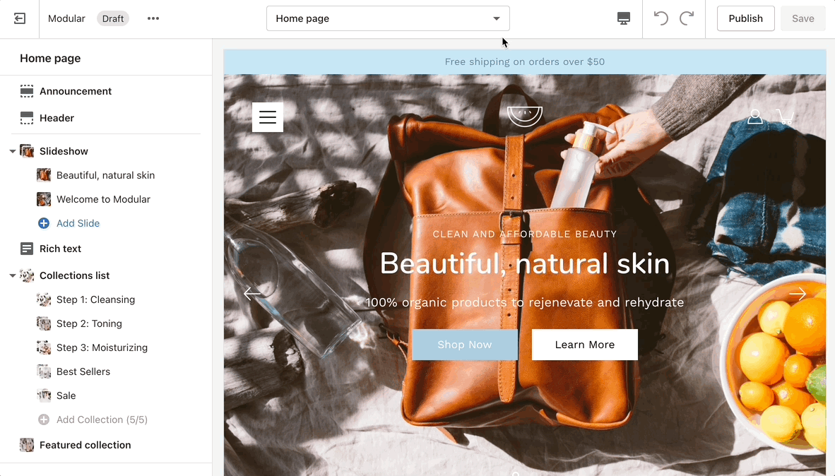 You can start customizing the page with the pre-defined sections included in Modular. You can hide, reorder, remove sections that are included, and also add any new selection from Modular's list of over 25+ sections.
