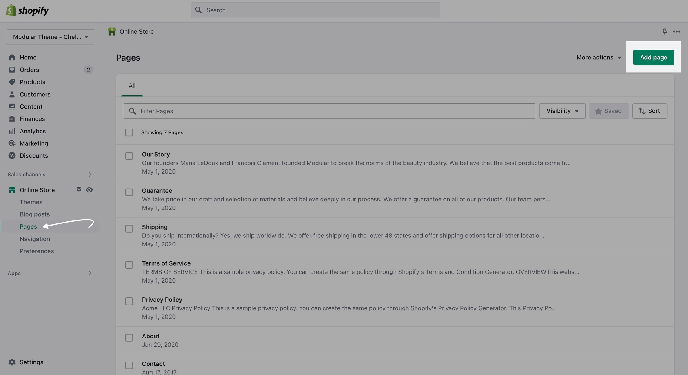 Pages are created in your Shopify Admin under Pages. Choose Add page to create a new page: