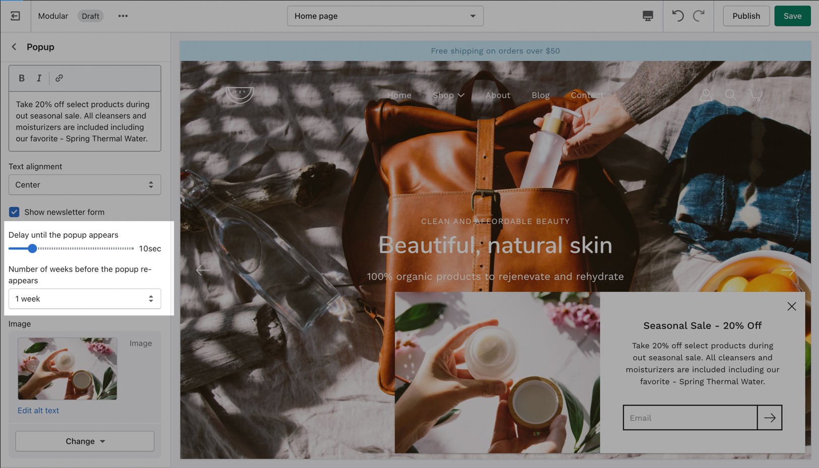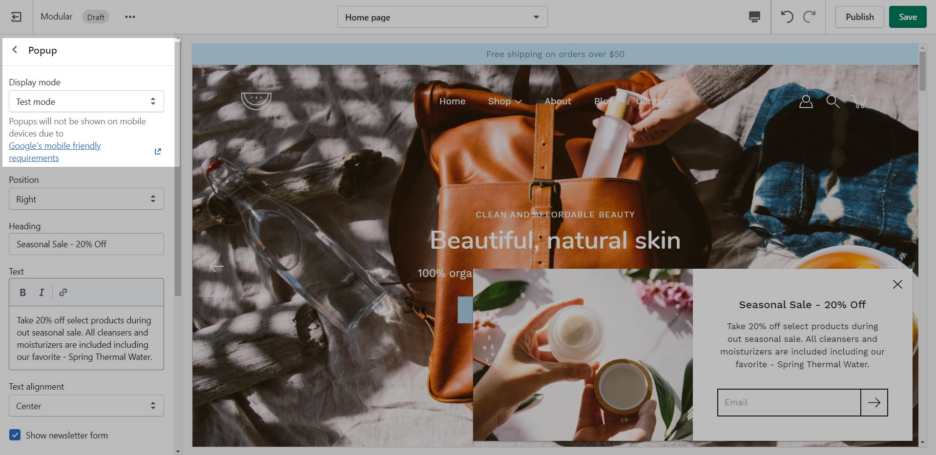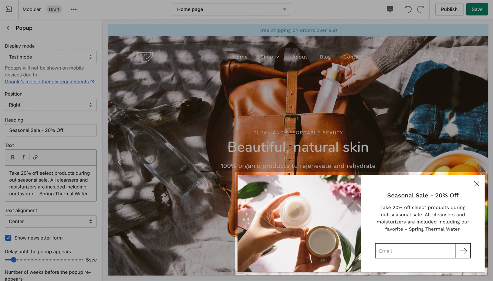 The popup section in Modular can be used as a newsletter popup or as a sales promotion tool to display custom messages and promo codes based on where the customer arrives from, is viewing, and how they are interacting with your site.