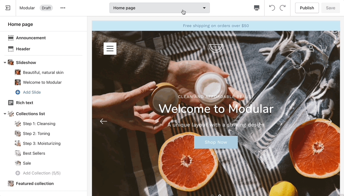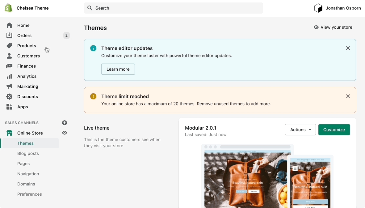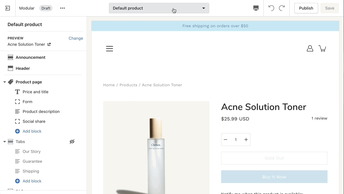 Note: You can only select the templates of your live theme. Make sure to publish your copy of Modular so that you can assign the new product page template.