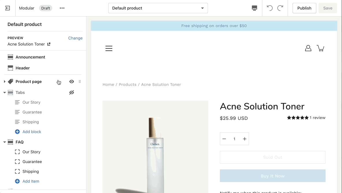 The new Product page template in our Modular theme is built from the ground up with the new features introduced in Online Store 2.0 in mind. The use of JSON templates allows for dynamic sections to be used to truly customize your product pages to your style.