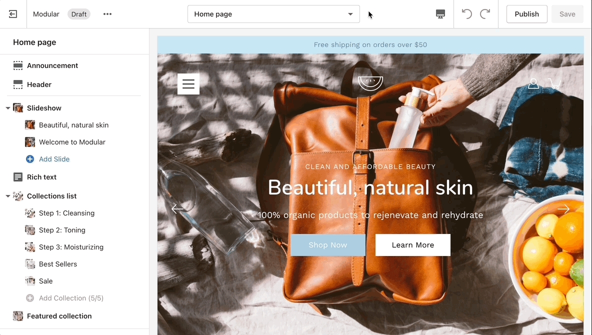 A big part of the settings can be accessed from the section blocks. They can also be moved around if you're looking to customize the look. You can move blocks the same way can sections. Each block has six small dots that you can click and hold to drag and drop them between one another.