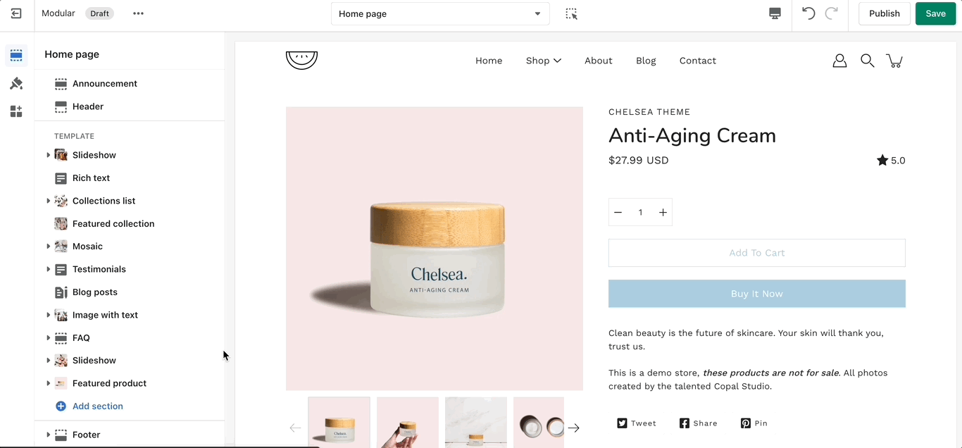 Use the 'Featured product' section to bring a product gallery and form to your store pages.