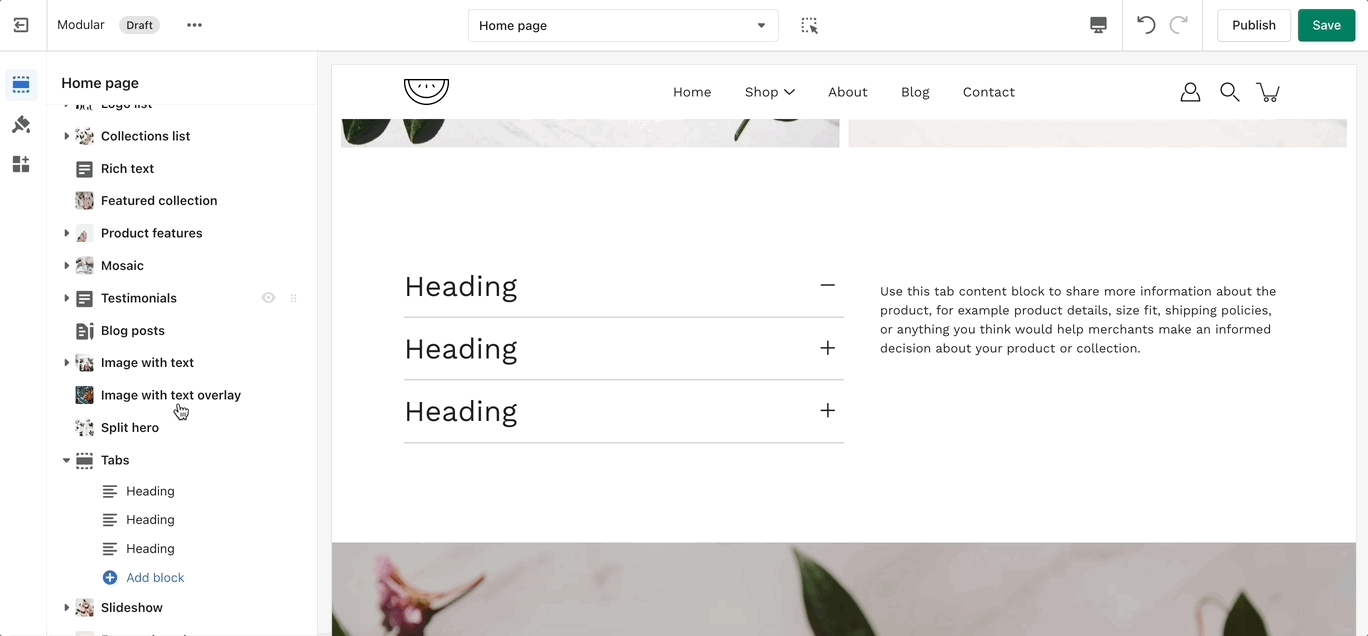 Add blocks by clicking on the small arrow next to the section then clicking 'Add block'.