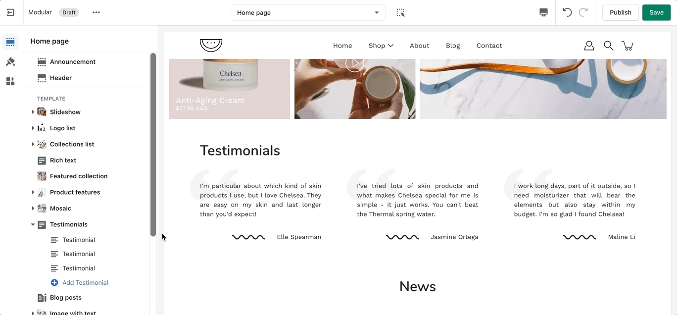 <figure><img src="https://content.gitbook.com/content/cslEBmhnE7vAvh3vPA8e/blobs/ENd6rzGJlcSrhVI71wVB/testimonials-section.gif" alt=""><figcaption><p>Set the general settings for the section.Set the individual contents for each block.</p></figcaption></figure>