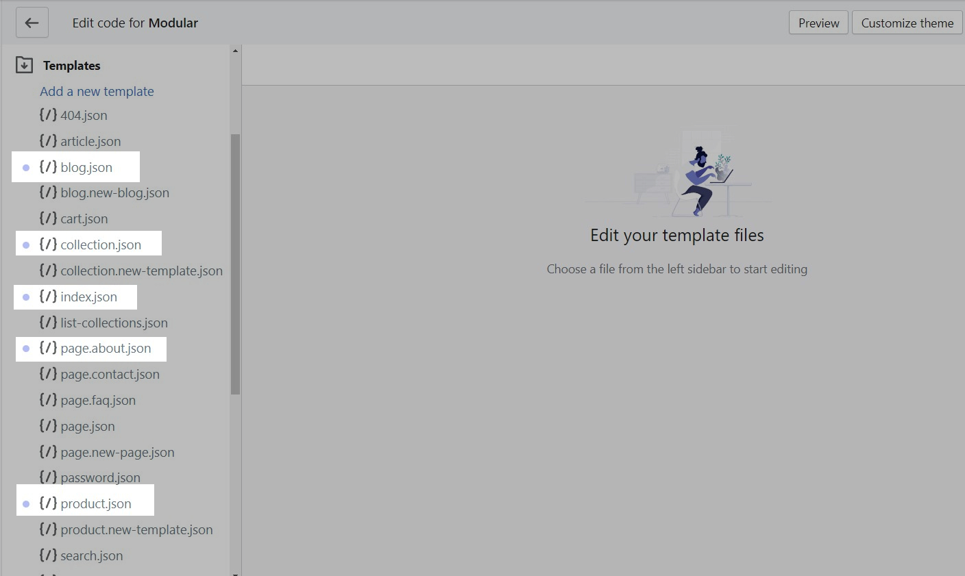 What you can do here is to open up the edited page templates, we'll use index.json for our example, and copy the content to paste in the new theme.