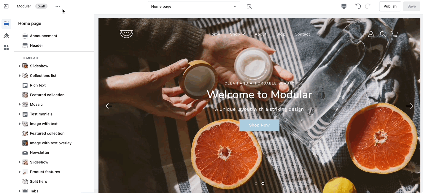 To check the version of your current copy of the Modular theme, click on the ellipses (three dots) icon at the top of the Theme Editor to view theme actions including the version number: