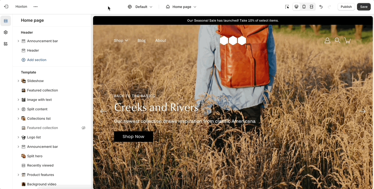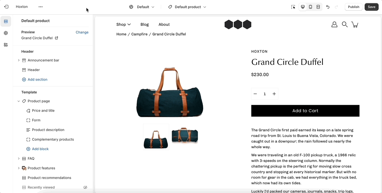 A big part of the settings can be accessed from the section blocks. They can also be moved around if you're looking to customize the look. You can move blocks the same way can sections. Each block has six small dots that you can click and hold to drag and drop them between one another.