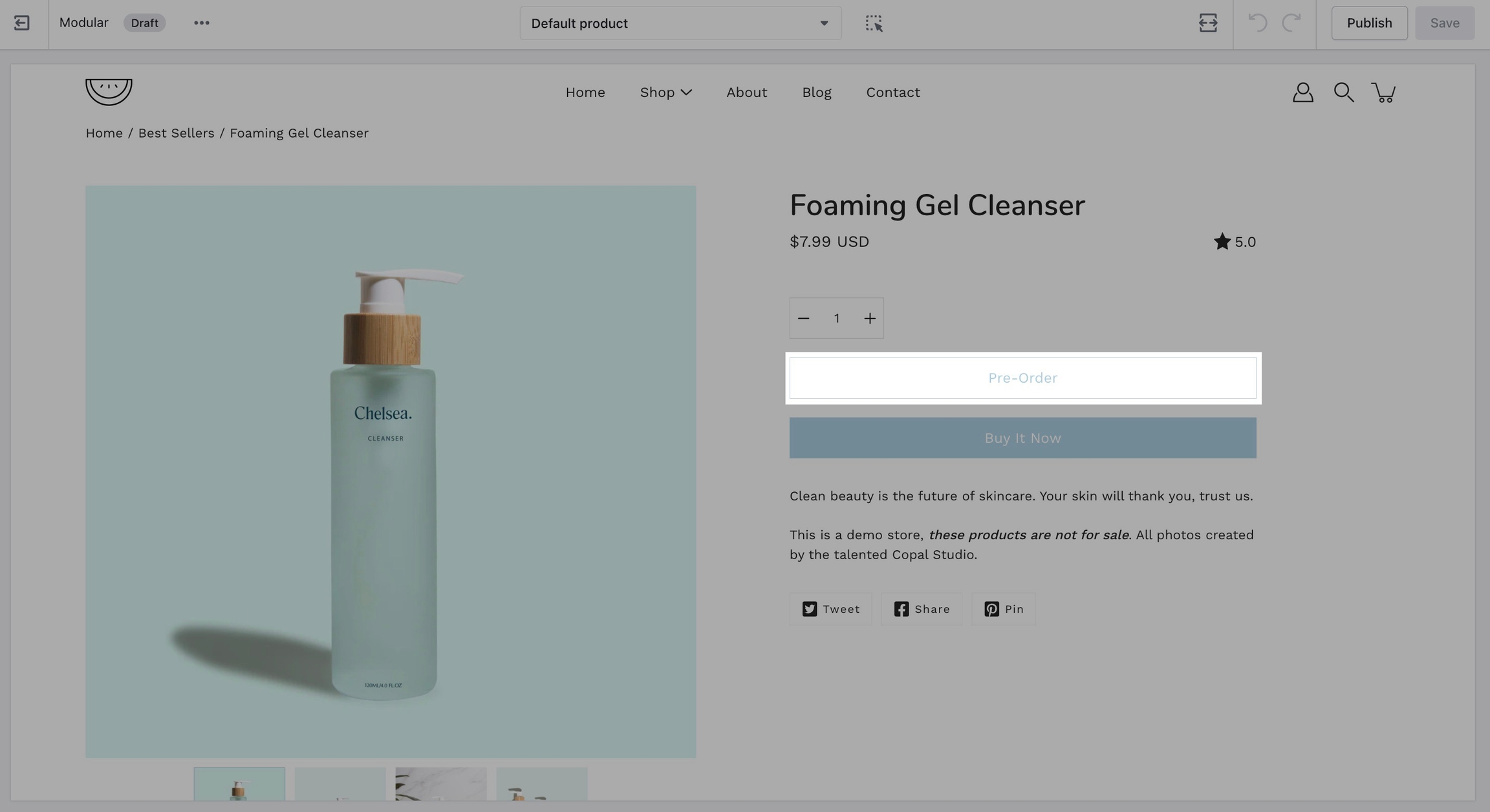 Modular uses product tags for creating pre-order products. When you define a pre-order tag, you can easily convert the 'add to cart' button to a 'pre-order' button.