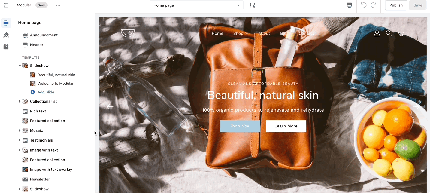 To find the primary settings for each section, click on the section name to view the settings panel. These settings control the elements of the section.