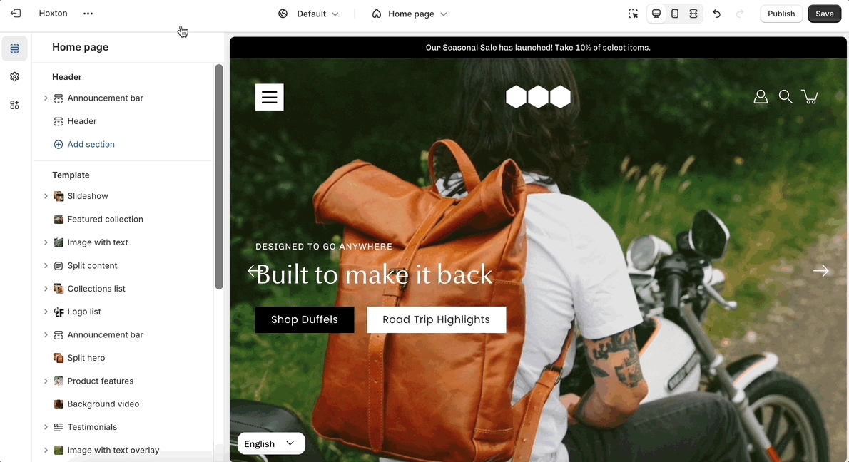 Display essentials: Select the collection you want to present to your customers and add promo blocks to advertise and highlight current promotions or a specific product.