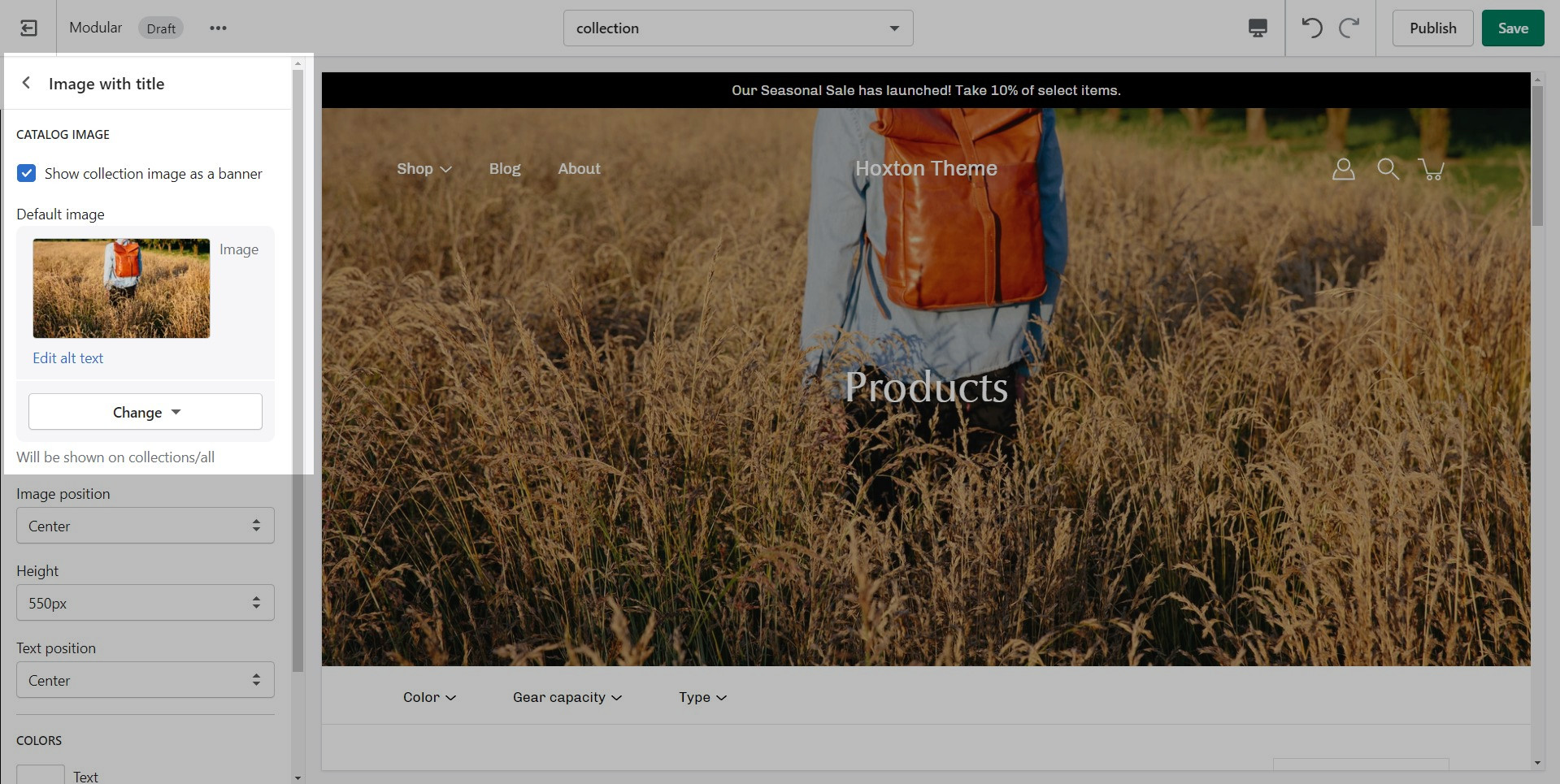 Modular provides you with options to specify the banner height. These include: Full Screen, Image Height, 750px, 650px, 550px.